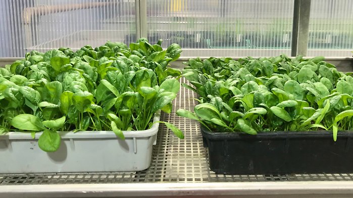 Spenatplantor från vitaliserat frö till vänster. Obehandlat frö till höger. Foto: Tongyun Shen.