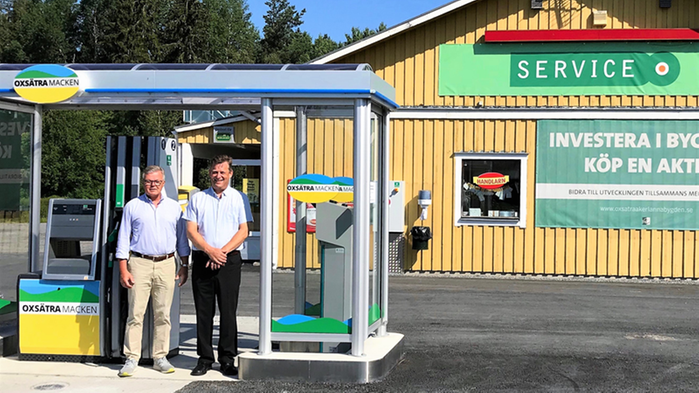 Thord Hägg och Niklas Axén från Bygdeägt AB framför den nybyggda tankstationen vid affären.