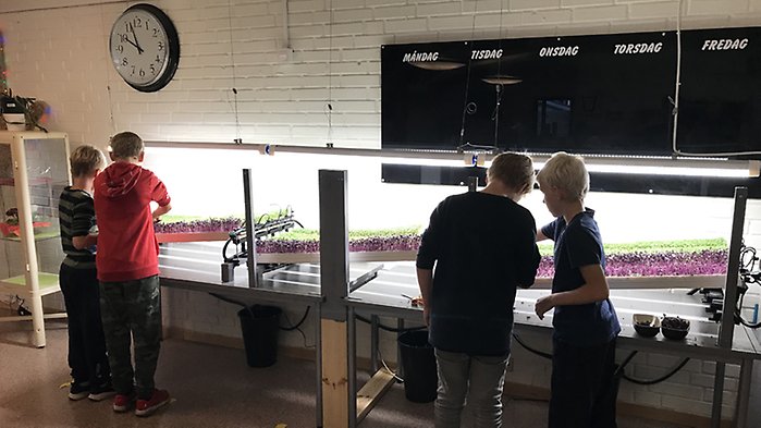Nu odlar vi bland annat svart senap, amarant, broccoli, koriander och rädisa i kanaler som det ligger en matta av hampa i. Vi har växtlampor och ett slutet system för vatten. Vi kör vattenpumpen fem minuter på förmiddagen och fem minuter på eftermiddagen, det räcker för att odlingen ska hålla sig fuktig. Kanalerna lutar och vattnet rinner igenom dem. Det vatten som växterna inte tar åt sig samlas upp och återanvänds. I odlingen tillförs ingen jord eller näring. Fröerna strösslas ut på en hampamatta och får gro i mörker tre, fyra dagar. Sedan plockas de ut till odlingsställningarna i skolrestaurangen och växer till sig i fem till åtta dagar. Växterna skördas när de har fått ett bladpar, då är de som mest näringsrika. Det sägs att det är 40 gånger högre näringsvärde i de här bladen än i en fullvuxen planta. I dag har vi tolv kanaler att odla i.