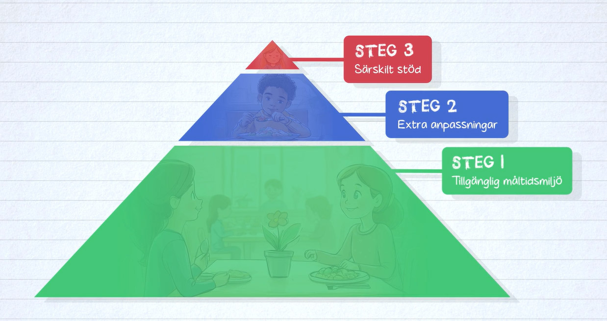 Skolorna ser också över måltidsplaneringen för att fler ska kunna äta mer av den ordinarie menyn. I Skövde kommun har salladsbufféerna förändrats, från mer ihopblandade sallader till rena, oblandade grönsaker. Det har lett till att barn och elever äter mer grönt. Trefackstallrikar hjälper vissa barn som behöver separera sin mat ännu mer.