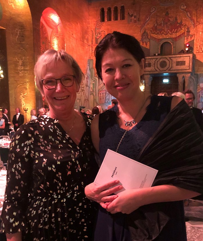 Eva Sundberg tillsammans med Sara Seing, kostchef i Södertälje kommun, på plats i Stockholms stadshus vid invigningsbanketten för Stockholm som Europas gastronomiska huvudstad 2023.