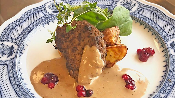 Vi har valt att servera biffarna med annan känd komponent, som på så sätt får bli smakbryggan över till vildsvinsfärsbiffen. I vårt fall har det varit gräddsås, rårörda lingon och rostad potatis men detta kan man ju självklart variera, till för måltidsgästerna andra kända komponenter.