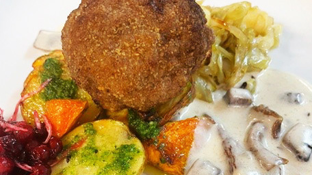 Hemgjorda biffar är alltid populärt oavsett gäst. Jag har försökt tänka säsongsanpassat med rotsaker, kål, svamp, lingon och svenska äpplen. Flera av dessa råvaror går ju säkert att få från lokala håll och närproducerat, beroende på var i länet man befinner sig och hur allas upphandlingar ser ut.Det finns också en tanke med näringen i rätten. Till exempel väljer jag rostade rotsaker istället för en puré som man brukar ha till wallenbergare, eftersom rätten då skulle bli för fet att servera till dagens skolungdomar, om man ska följa rekommendationer från Livsmedelsverket