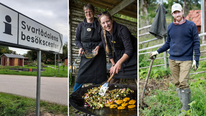 Kollage. Från vänster: En vägskylt med Svartådalens besökscenter, två kvinnor som lagar mat på en stekhäll och en man med spade.