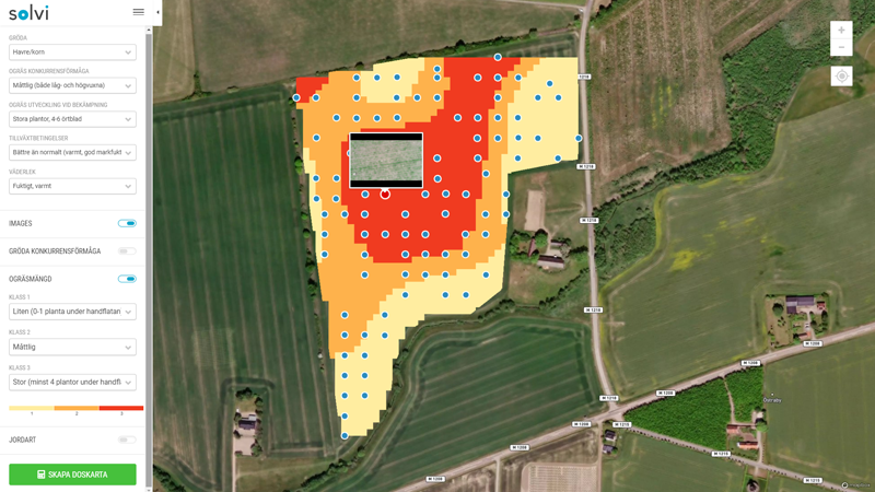 Det tredje steget är att resultatet av bildanalysen används för att ta fram en platsspecifik dos av ogräsmedlet med hjälp av Jordbruksverkets dosnyckel. Det gör man i ett verktyg från Solvi, där man först klickar i sin bedömning av ogrästryck efter dosnyckelns kriterier, samt andra faktorer som kan påverka; väder, preparat, körhastighet, munstycken och liknande. Man kan behöva komplettera med kunskap om ogräsflora eftersom appen inte kan bestämma ogräsart. Ur detta får man ut en styrfil som anpassar dosen platsspecifikt i den sprut-utrustning man har på gården.