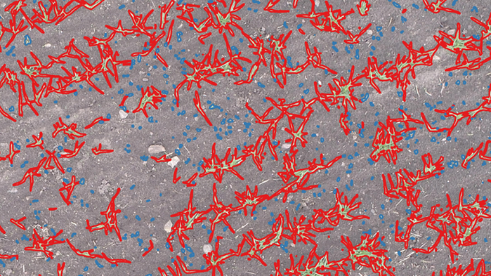 Bildtext: Resultat av bildanalys, rött är gröda och blått är ogräs.