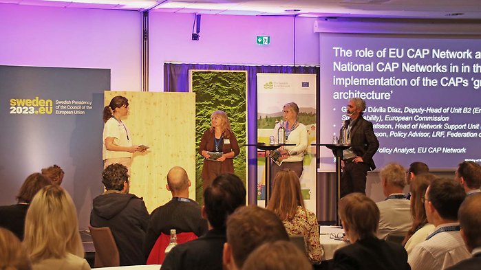 Landsbygdnätverkets arbetsgrupp miljö och klimat var med och planerade miljökonferensen. Sofia Björnsson, som är gruppens ordförande, var också mötets moderator. Här resonerar hon tillsammans med Maria Gustafsson, Kaley Hart och Gregorio Dávila Díaz om nätverkets roll i genomförandet av miljö- och klimatåtgärder inom den gemensamma jordbrukspolitiken. (Maria Gustavsson, kanslichef, Landsbygdsnätverket. Kaley Hart, EU CAP-Network och Gregorio Dávila Díaz från EU-kommissionens DG Agri, Directorate-General for Agriculture and Rural Development.