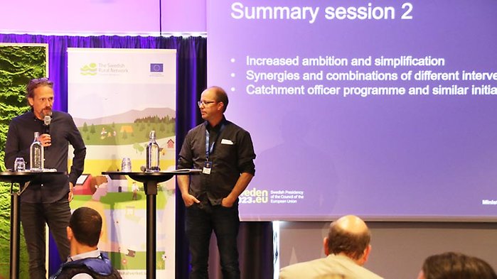 Flemming Gertz från SEGES Innovation i Danmark och Markus Hoffmann från LRF sammanfattar en gruppdiskussion om hur man kan arbeta med rådgivning och samordning av miljö- och klimatåtgärder på landskapsnivå.