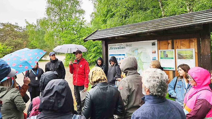 Foto från studieresa. Anders Rosell från Stiftelsen Skånska Landskap berättade för några av deltagarna om hur stiftelsen förvaltar strandbetena på Järavallen. De har inga djur själva utan arrenderar ut marken till en lantbrukare som betar med mjölkraskvigor.