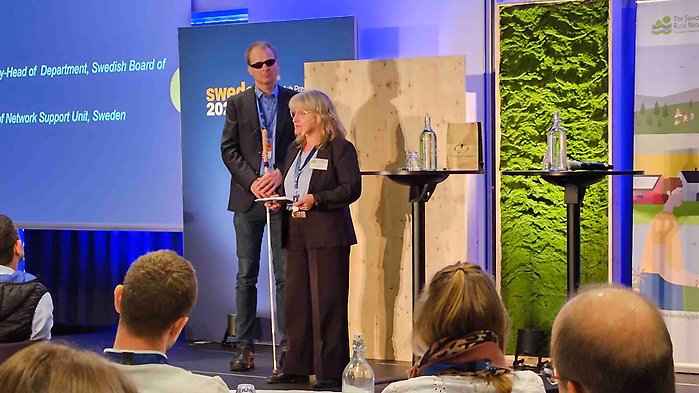 Mötet avslutades på onsdagens eftermiddag i en positiv anda. Den gemensamma förhoppningen hos deltagarna var att det kommer finnas fortsatta möjligheter att träffas och utbyta kunskap och erfarenheter inom detta område. På bilden syns Landsbygdsnätverkets Maria Gustafsson och Jordbruksverkets Andreas Mattisson under avslutningssessionen. De håller på att reflektera kring och summera dagarna som gått.