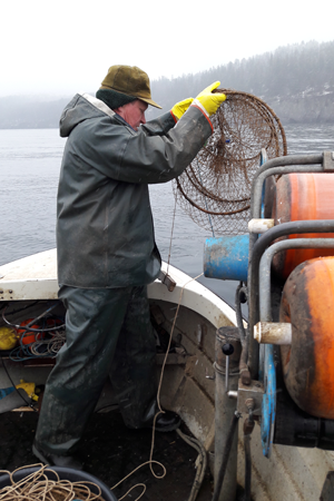 Jonny Ståhl kastar i fångstnät från en mindre fiskebåt.