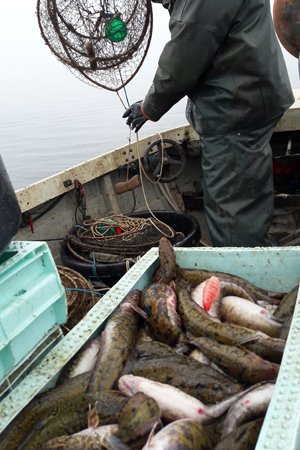 Låda med fångad lake på en mindre fiskebåt.