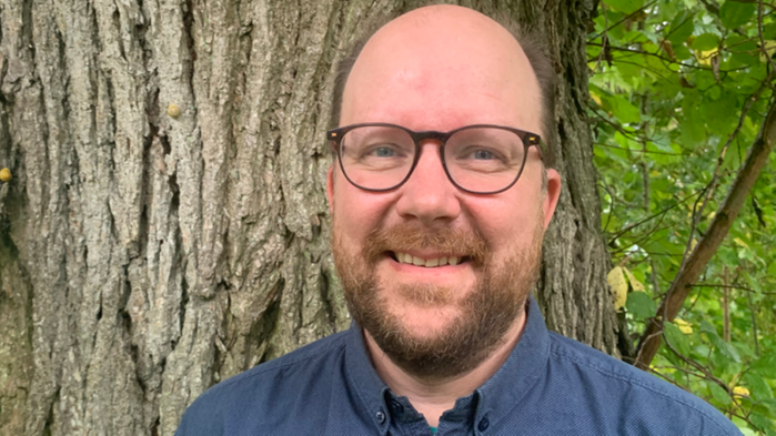 Magnus Ljung är verksamhetsledare på Sveriges lantbruksuniversitet (SLU) RådNu - kompetenscentrum för rådgivning. Han har blå jeansskjorta och står lutad mot barken av ett träd
