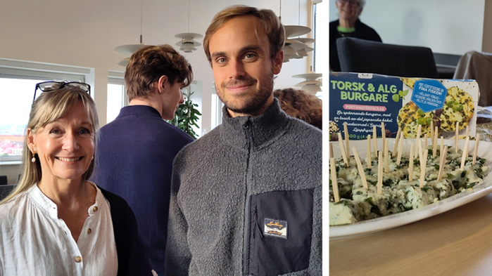 Ingrid Undeland, Chalmers, ansvarig för projektet och Kristoffer Stedt, Göteborgs universitet, som har odlat alger i näringsrika sidoströmmar från beredningsindustrin. På bilden till höger syns smakbitar av torsk- och algburgare som idag finns på marknaden. Foto: Carl Dahlberg.
