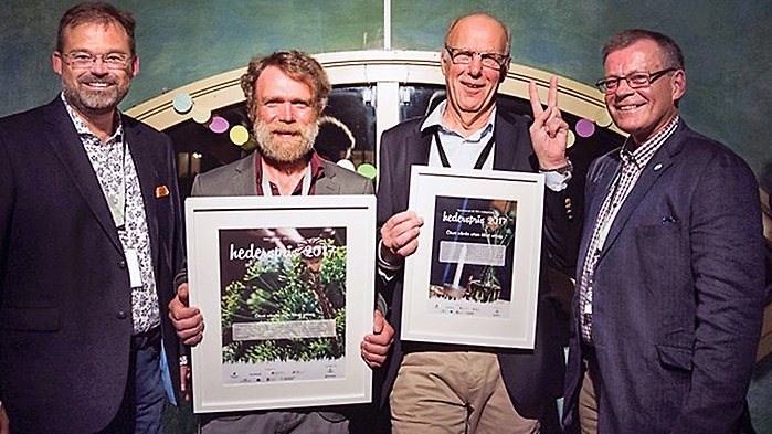 Tomas Kruth, Fastighetsägarna, Glenn Fridh, vinnare, Ingmar Elofsson, vinnare och Magnus Nordgren, Jordbruksverket, vid prisutdelningen av 250 möjligheters hederspris 2017.