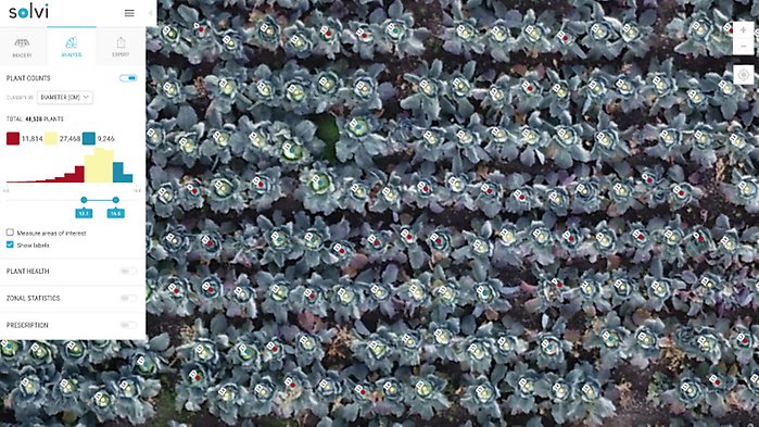 - Det ser mycket bra ut, men det finns ännu en del saker att jobba vidare med. Tre-fyra centimeter i diameter på ett vitkålshuvud gör ett helt kilo i vikt, så om den ligger lite snett eller med ett blad över, så blir det plötsligt svårare att göra bedömningen. Till den här säsongen ska vi prova att köra på lägre höjder för att få bättre bildkvalitet, säger Igor Tihonov, grundare av Solvi AB.