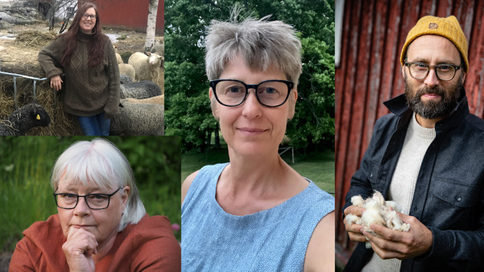 Fia Söderberg, Annkristin Hult, Jenny Andersson och Erik Blomberg i podden Landet om svensk ull. Foto Leif Yttergren, Kjell Hult, privat och Anette Andersson