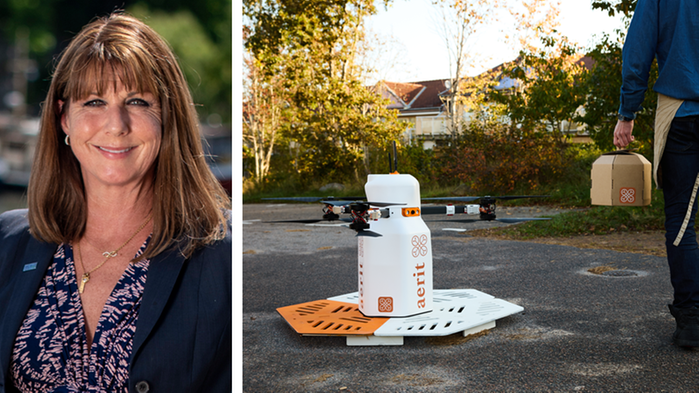Kollagebild. Porträtt på kvinna med brunt hår. Bilden till höger visar en drönare samt en person som håller ett paket.